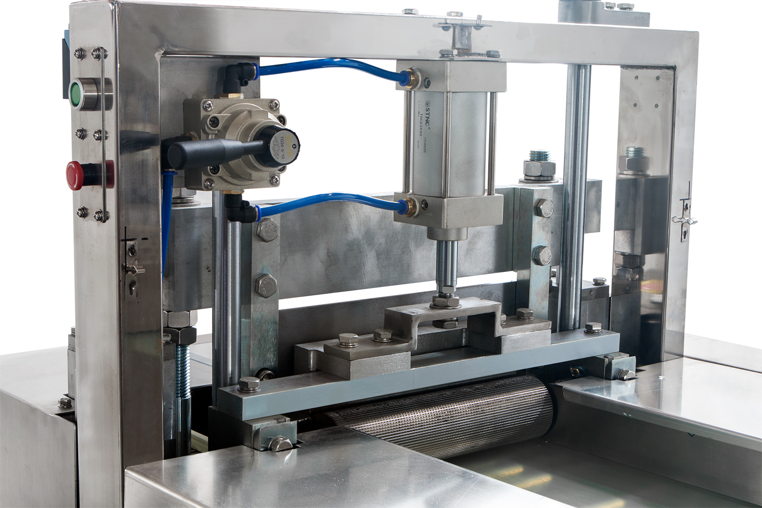 特制的輸送帶和壓料機(jī)構(gòu)將物料按設(shè)定的長(zhǎng)度,作步進(jìn)平行移動(dòng),垂直上下往復(fù)運(yùn)動(dòng)的切刀機(jī)構(gòu)直接在輸送帶上切斷物料。